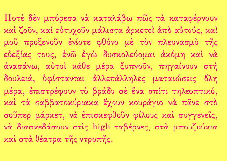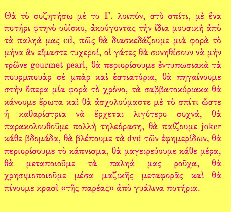 Ἀγαπητὲ Δημήτρη, ἀνέκαθεν ὀνειρευόμουν νὰ μπορῶ νὰ βιοπορίζομαι λαγνευόμενος καὶ πορνευόμενος. Δυστυχῶς, ὅμως, εἶμαι χονδρὸς καὶ δύσμορφος, καὶ μεσῆλιξ πλέον ἐπίσης… Νὰ θεωρεῖς λοιπὸν τυχερὸ τὸ Διαδίκτυο ποὺ δὲν τὸ ὑποβάλλω στὴ δοκιμασία νὰ φιλοξενεῖ προσωπικές μου γυμνὲς φωτογραφίες.