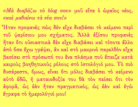 ε, μην τα θέλουμε κι όλα δικά μας αγαπητέ, και ωραίος και νέος και με μυαλό; εδώ πια θα ομιλούσαμε περί λαχείου Ἀπάντηση