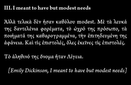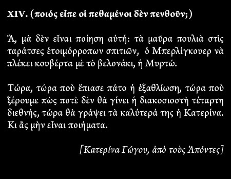 Τυπικά, εἶναι ὅλες νεκρές, πλὴν βεβαίως τῆς τελευταίας. Ὅσο μὲ ἀφορᾶ, ὅλες οἱ νεκρές μου ποιήτριες εἶναι ποιήτριες, καὶ μάλιστα τὶς ἀγαπῶ ἰδιαίτερα..